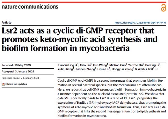 Recently, Professor Li Weihui’s team from the College of Life Science and Technology of Guangxi University published an online paper entitled "Lsr2 acts as a cyclic di-GMP receptor that promotes keto-mycolic acid synthesis and biofilm formation in mycobacteria " in Nature Communications ", which discovered a new second messenger receptor Lsr2 and revealed that c-di-GMP promotes the synthesis of mycobacterial acid, a new molecular mechanism regulating the formation of bacterial biofilms.
