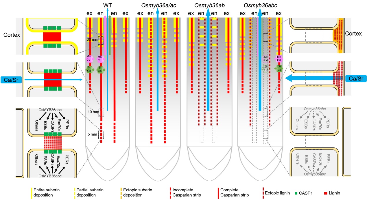 如图2所示,在根尖区域(~ 5 mm),三个OsMYB36成员在野生型(WT)中共同激活内皮层凯氏带相关基因(如CASPs、ESBs和PERs)的表达,启动凯氏带在内皮层形成,但在Osmyb36abc突变体中,这些基因则不能被激活。而且,OsCASP1蛋白不能在Osmyb36abc突变体内皮层凯氏带形成区积累。在根伸长区(~ 10 mm),外皮层凯氏带在野生型和突变体植株中均未完全形成,内皮层凯氏带在野生型已完全形成,但Osmyb36a和Osmyb36ac突变体的内皮层凯氏带未完全形成,导致更多的Ca/Sr(蓝色箭头)通过质外体途径进入突变体的木质部,最终Ca在突变体的地上部分显著增加。Osmyb36ab和Osmyb36abc突变体的内皮层凯氏带是完全缺失的,与Osmyb36a或Osmyb36ac突变体相比,更多的Ca通过质外体途径流入Osmyb36ab和Osmyb36abc突变体的木质部(蓝色箭头)。在根的成熟区(15 ~ 30 mm),野生型和突变体的外皮层凯氏带都完全形成,阻止了质外体途径运输。此外, OsMYB36a或OsMYB36ac的突变诱导了内皮层木质素的异位积累和木栓质的提前异位沉积,而OsMYB36ab或OsMYB36abc的突变诱导了外皮层木栓质的提前沉积,并延迟了木质素和木栓质在内皮层细胞面向中柱鞘或皮层的细胞壁角落或侧面的积累。在Osmyb36abc突变体中,内皮层凯氏带的完全缺失也引起转运蛋白在内皮层细胞膜上累积减少或者无累积,从而导致相关元素的吸收效率降低。如Si/Ge和Mn/Cd的吸收,Lsi1和OsNramp5定位在内皮层和外皮层,其中Lsi1介导Si/Ge的吸收(绿色箭头),OsNramp5介导Mn/Cd的吸收(红色箭头)。因此,水稻凯氏带的缺陷对根系的矿质元素选择性吸收有显著影响。