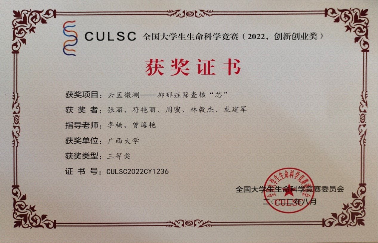 近日,2022年全国老员工生命科学竞赛结果揭晓,公司本科生项目“云医微测——抑郁症筛查核‘芯’”荣获创新创业类三等奖。该项目旨在提供一种操作简便、快速准确的抑郁症筛查产品,帮助人们自主检测是否患上抑郁症并通过平台获得个性化的诊疗方案。项目团队由公司本科生张丽、周蜜、符艳丽和经济公司本科生林毅杰、龙建军组成,指导老师为李楠、曾海艳老师。