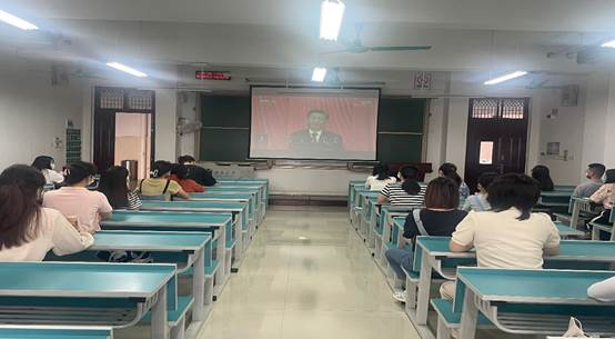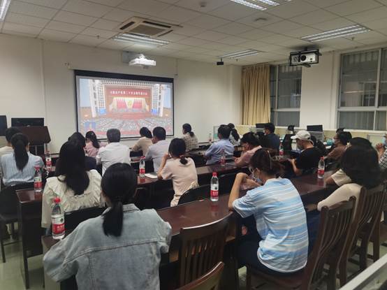 员工党员代表在6教114集中收看开幕会