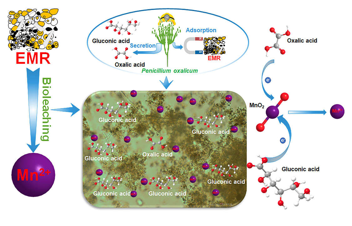 本研究成果成功分离鉴定了一株草酸青霉Z6-5-1,该菌株能高效地从电解锰废渣中浸出锰离子,浸出率达到93.33%。生物锰浸出后残渣符合《污水综合排放标准》及《地表水环境质量标准》的排放要求,可直接排放。草酸青霉Z6-5-1的高效锰浸出需要分泌有机酸和菌丝的直接接触。本研究为生物锰浸出工业提供了潜在微生物菌种,进一步解析了其生物锰浸出机理,为电解锰废渣中锰回收利用提供了理论基础,有利于其资源化利用和环境保护。
