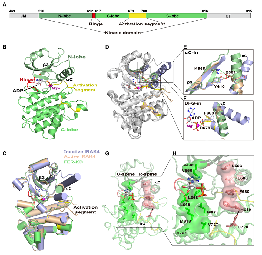 一般激酶在非磷酸化前,采用一类“αC-out”和/或“DFG-out”的失活构象,经磷酸化诱导形成“αC-in”和“DFG-in”的激活构象。研究人员获得了非磷酸化的FER-KD与ADP和Mg2+复合物(FER-KD-ADP-Mg2+)的晶体结构,发现未磷酸化的FER-KD采用“αC-in”、“DFG-in”的激活构象。为了确认FER-KD激活构象的形成确实不依赖于磷酸化,研究人员进一步解析了FER不能发生自磷酸化的突变体K565R以及自磷酸化能力部分降低的突变体S525A与核苷酸以及Mg2+复合物的晶体结构,发现这两类FER-KD的突变体均为激活构象形式。表明非磷酸化的FER-KD可以形成激酶激活状态下的典型构象。