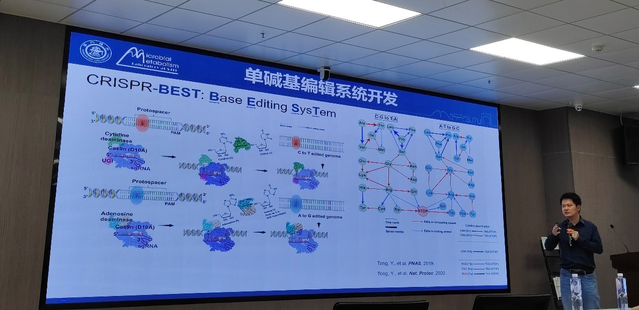 接着童垚俊教授作题为“微生物多功能CRISPR基因编辑工具箱”的学术报告。童教授从2013年起就致力于合成生物学研究,利用“基因剪刀”crispr为放线菌构建了一个多能的遗传操作“工具箱”,这些工具可以大大提高设计和改造特定微生物的进程。这些经过特定“设计和改造”后的微生物,有望兼容多种代谢途径后成为智能微生物细胞工厂,去行使环境污染物的高效生物降解、生物活性分子的绿色环保生物合成、特定药物分子的原位靶向递送治疗相关疾病等多种功能。目前这套工具箱已无偿分享给了全球包括美国劳伦斯伯克利国家实验室、美国伯克利大学、康奈尔大学等100多家单位使用。