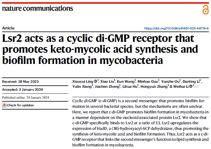 近日,william威廉英国官网李伟辉教授团队在Nature子刊Nature Communications上在线发表了题为“Lsr2 acts as a cyclic di-GMP receptor that promotes keto-mycolic acid synthesis and biofilm formation in mycobacteria”的研究论文,发现了新的第二信使受体Lsr2,揭示了c-di-GMP促进分枝杆菌分枝菌酸的合成,从而调控细菌生物被膜形成的分子新机理。