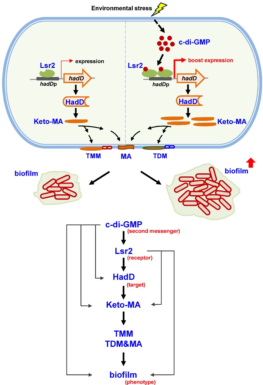 研究团队发现Lsr2作为第二信使c-di-GMP的新受体,以1:1的比例特异性结合。此外,Lsr2通过正调控(3R)-羟基酰基-ACP脱水酶(HadD)的表达来介导分枝杆菌细胞壁的主要组分keto-分枝菌酸的合成,从而促进细菌生物被膜的形成。更有意思的是,c-di-GMP可以作为Lsr2的激活剂,增强Lsr2对HadD的正调控作用。以上研究结果将为通过阻断细胞壁脂质合成来抑制结核分枝杆菌的多重耐药性提供策略,进而为发现抗结核新药靶与研发新型疫苗提供理论依据。