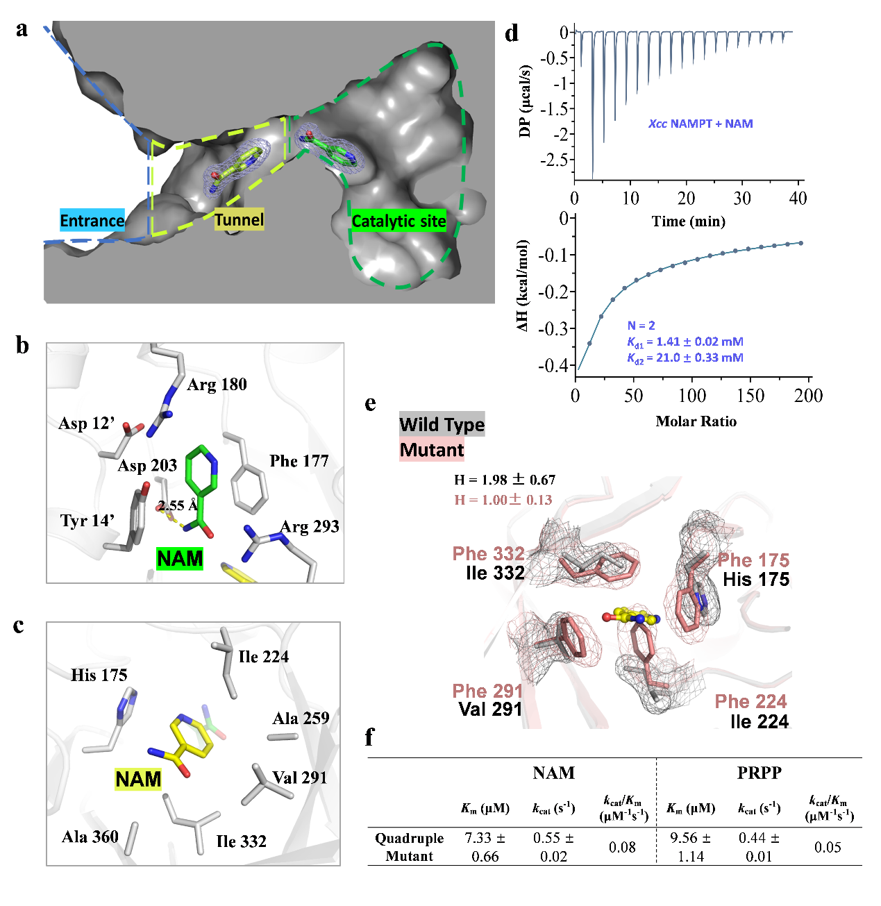 研究者发现一个Xcc NAMPT分子可以同时结合两个NAM底物分子,一个结合在活性中心,另一个结合在附近的通道。这个结论得到了ITC实验和酶动力学实验的有力支持:ITC滴定曲线最终拟合的结合位点数为2,且Kd1 < Kd2,说明Xcc NAMPT蛋白确实存在两个NAM结合位点,并且NAM在通道位点的结合与其在催化位点的结合具有正协同效应;酶动力学实验发现Xcc NAMPT对底物NAM的希尔系数约为2,与两个底物结合位点所表现出的正协同性相一致。这些发现强烈地提示通道位点通过结合底物分子,在NAMPT催化过程中发挥重要作用。