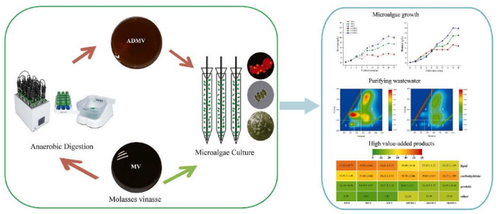 糖蜜酒精废水是甘蔗糖蜜生产酒精过程中产生的副产物,其化学需氧量与硫酸盐浓度高,处理难度大。微藻能够将含碳、氮和磷的有机物转化为脂质、蛋白质和其他活性成分,在废水的厌氧消化处理方面具有很大的应用潜力。课题组将厌氧消化和藻类处理相结合,解决了糖蜜酒精废水极端特性对微生物菌群的抑制,成功实现糖蜜酒精废水高效资源化利用和藻类高价值产物回收,为糖蜜酒精废水无害化处理提供了新思路。