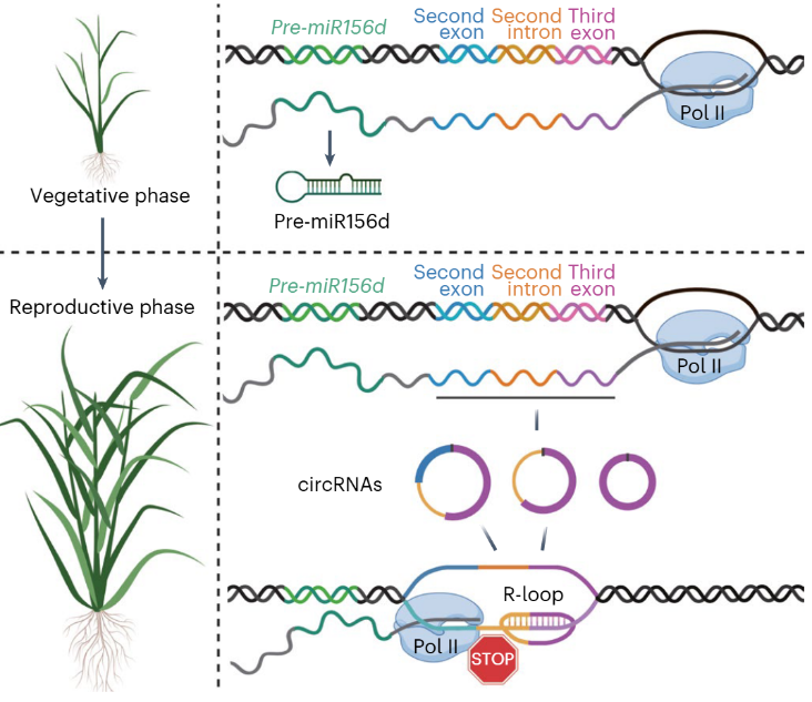 该团队首次报道了来源于水稻pri-miR156d的环状RNA(ciMIR156Ds)通过与其模板DNA形成R-loop的方式负调控miR156水平的全新分子机理。该研究发现ciMIR156D水平随植物年龄增长而增加,并能降低pri-miR156d和miR156的水平,启动水稻开花抽穗进程。ciMIR156Ds与MIR156D在母基因形成R-loop,该结构减少了RNA聚合酶II的转录延伸,从而阻碍了pri-miR156d的合成。这些发现揭示了一种通过环形RNA精细调控年龄开花途径分子钟miR156的新颖机制,为培育抽穗期多样化的水稻品种提供了新的理论依据。