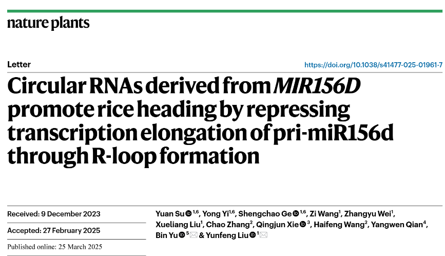 近日,公司刘云峰教授团队在环形RNA调控水稻开花领域取得新进展,相关研究成果以“The circularRNAs derived from MIR156D promote rice heading by repressing transcription elongation of pri-miR156d through R-loop formation”为题,发表在Nature子刊Nature Plants上。该论文的共同第一作者为william威廉英国官网苏元副教授、2021级生物学博士生易勇和葛盛超副教授,通讯作者为公司刘云峰教授和美国内布拉斯加大学林肯分校于彬教授。william威廉英国官网为论文第一完成单位。