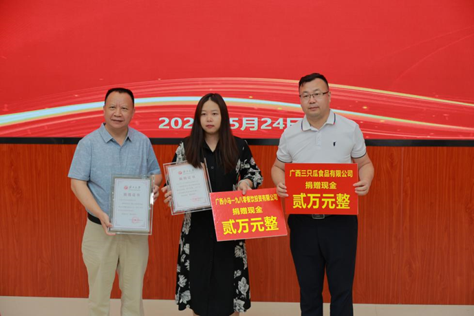 捐赠仪式上,刘心玫代表广西小马一九八零餐饮投资有限公司董事长马中才员工,向公司捐赠人民币2万元和个人著作。广西三只瓜食品有限公司董事长龙晓鹏员工向公司捐赠人民币2万元。公司同期举行了助学金颁发仪式,向10名家庭经济困难员工发放助学金每人2000元。