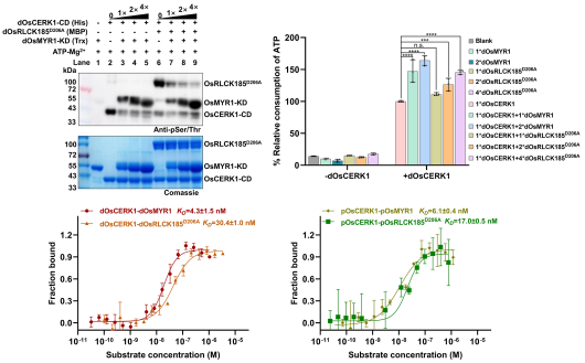 为了进一步探究底物多肽对OsCERK1的影响,研究人员对受体样细胞质激酶OsRLCK185和共生受体OsMYR1进行了研究。功能实验表明,底物OsMYR1和OsRLCK185均可变构增强OsCERK1的活性,其中OsMYR1的激活能力更强。这种增强作用与底物结合亲和力相关,而磷酸化并不总是能提高这种亲和力。