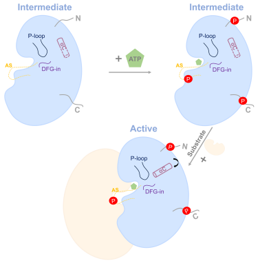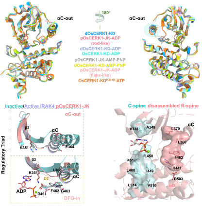研究人员通过解析OsCERK1胞内激酶域在不同磷酸化状态(磷酸化或去磷酸化)和核苷酸底物结合(无核苷酸结合、ADP、ATP或ATP类似物AMP-PNP结合)下的9种截短结构,发现其区别于传统的激酶构象,始终采取一种介于“活性”与“非活性”之间的中间构象(aC-out和DFG-in)。该构象下,OsCERK1与ATP结合的结构元件处于激活状态,而与底物多肽结合的元件处于非激活状态,暗示从中间构象到激活构象的转变很可能由底物多肽结合触发。