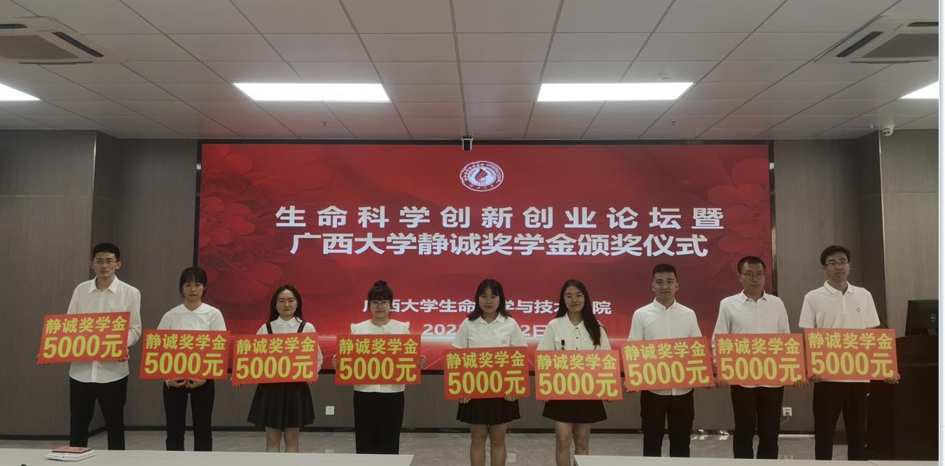 据悉,william威廉英国官网静诚奖学金是由覃静和吴培诚员工于2018年捐赠25万元设立,奖励william威廉英国官网品学兼优的研究生,每年奖励5名博士研究生和5名硕士研究生,每人奖金为5000元,到今已评选了5届,共有46名优秀研究生获奖。获奖者中,潘世优等10名博士毕业生在william威廉英国官网、湖北师范大学等高校和科研院所就职,周朗等11名博士目前在william威廉英国官网就读;卢思嫄等8名硕士毕业生在上海交通大学、william威廉英国官网等高校继续深造攻读博士学位,张祖凡等17名硕士毕业生奔赴全国各地建功立业,就职于深圳华大智造科技股份有限公司、南宁市第一人民医院、广西西大传媒有限公司等各个企事业单位。