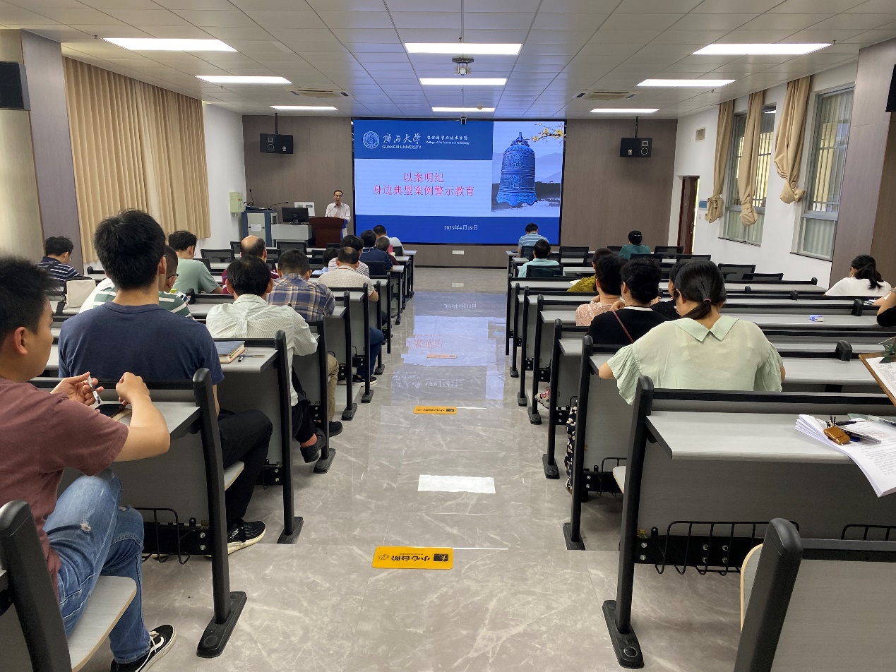 4月19日,公司在南106室召开“以案明纪-身边典型案例警示教育”大会,公司党委副书记、纪委书记覃健强组织全体教职工集中观看廉政警示教育专题片《沉重的忏悔 深刻的警醒》。