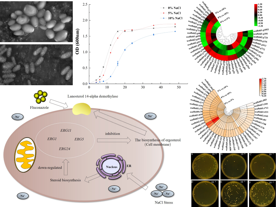 研究团队采用多组学结合的方法系统揭示了高浓度NaCl胁迫下海洋季也蒙毕赤酵母GXDK6的脂质代谢机制,并测试了GXDK6在脂质代谢转变时对抗生素的敏感性。全基因组、转录组和蛋白组数据发现,与无盐胁迫相比,当GXDK6感知10% NaCl胁迫时,调控细胞出芽的AYR1显著下调2.69倍,其调控的蛋白NADPH-dependent 1-acyldihydroxyacetone phosphate reductase显著下调1.35倍,表明盐胁迫下GXDK6的细胞增殖被削弱。10%NaCl胁迫下GXDK6的OD600值下降了64.39%,也验证了这一发现。同时,盐胁迫促使DEGs(如GUT1、GPP1、TDA10)和DEPs(如glycerol kinase、aldehyde dehydrogenase)显著富集在调控甘油代谢的通路(甘油磷脂代谢、甘油脂代谢),使甘油在胞内大量积累,可知甘油贡献于GXDK6的耐盐生存。这与外源添加甘油探究其对盐胁迫下GXDK6生长的验证试验结果一致。此外,我们发现盐胁迫有助于增强氟康唑对真菌的杀伤作用。与不含盐胁迫相比,GXDK6的菌落数在10% NaCl和64 μg/mL氟康唑条件下降低97.70%。表明氟康唑高度选择性干扰真菌的细胞色素P-450的活性,抑制了真菌细胞膜上麦角固醇的生物合成,且感知盐胁迫后,季也蒙毕赤酵母中调控麦角固醇合成的基因(ERG1、ERG5、ERG11、ERG24)和蛋白(如羊毛甾醇14-α脱甲基酶)也显著下调表达,进一步抑制了麦角固醇的合成,从而强化了氟康唑的杀灭作用。该研究为Meyerozyma guilliermondii在盐胁迫下的脂质代谢调控机制提供了新的见解,可为增强氟康唑对真菌的杀灭作用提供了新途径(Frontiers inGenetics. 2022. 12: 798535)。