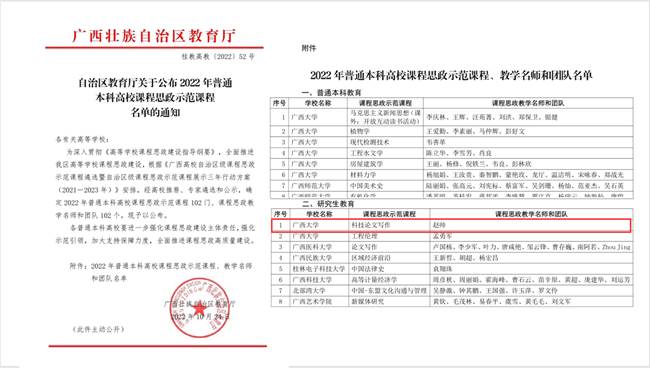 近日,自治区教育厅公布了2022年普通本科高校自治区级课程思政示范课程名单,公司《科技论文写作》课程被认定为自治区级课程思政示范课程,赵帅老师被认定为自治区级课程思政教学名师。